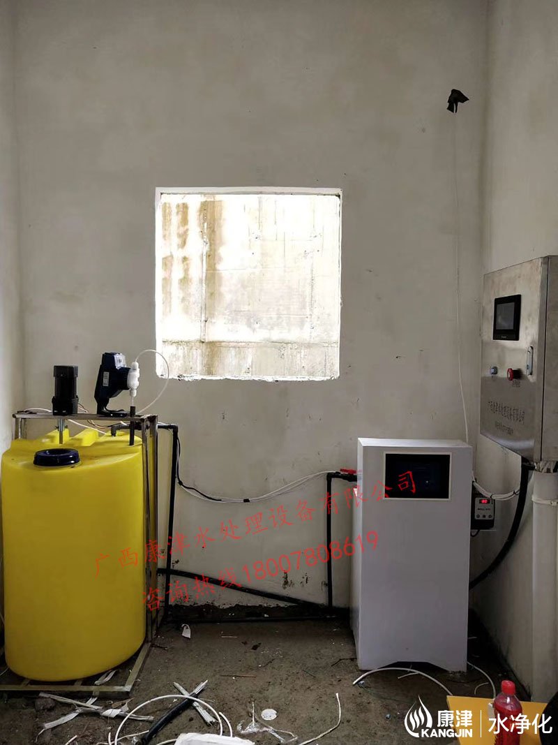 工艺流程:河水-絮凝加药-石英砂过滤器-二氧化氯加药器-净水箱-各用水点